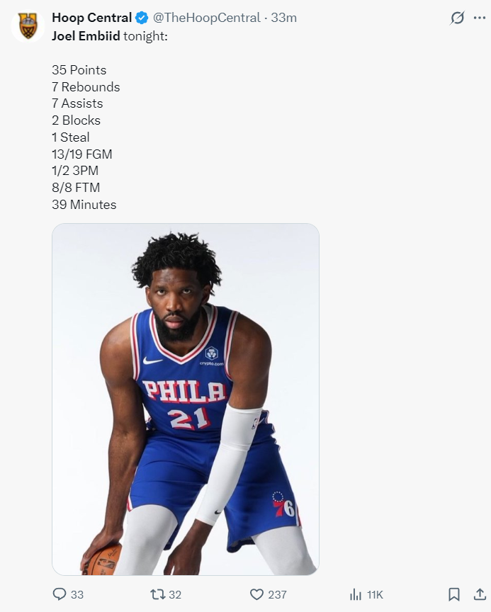 恩比德在第三节再度化身表演艺术家,朝艾顿身上跳自己倒地还去要犯规,拉拉维亚不伸手他投篮抬肘击中拉拉维亚胸口裁判给2+1,恩比德表演后两个中投命中完成30+,三节28分钟,恩比德15中11+三分1中1+罚球7中7拿到30分7篮板6助攻1抢断2盖帽。